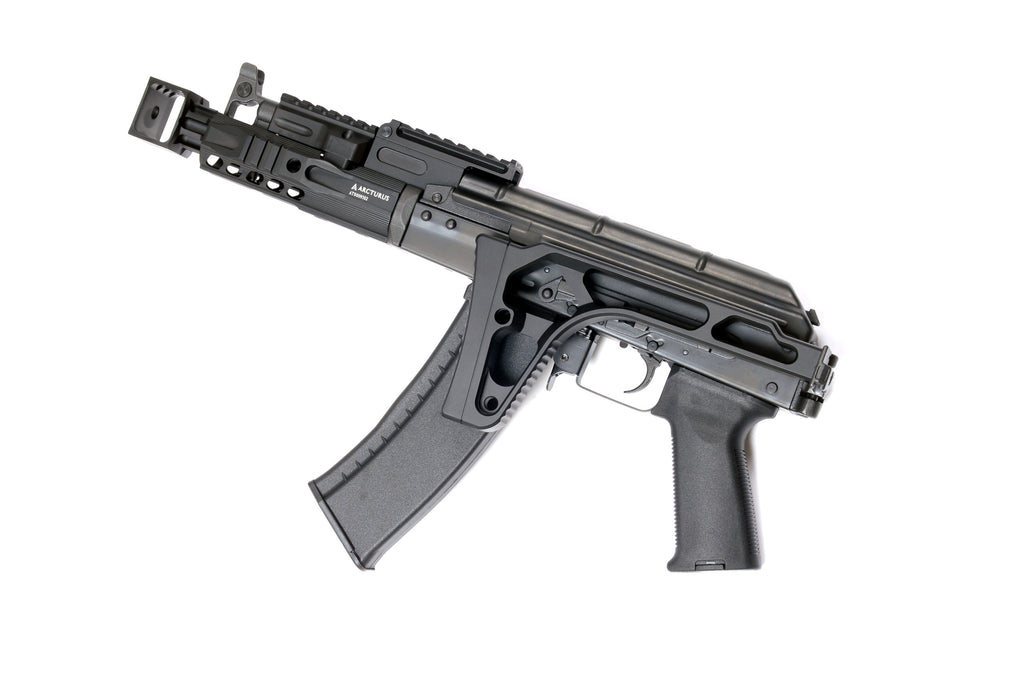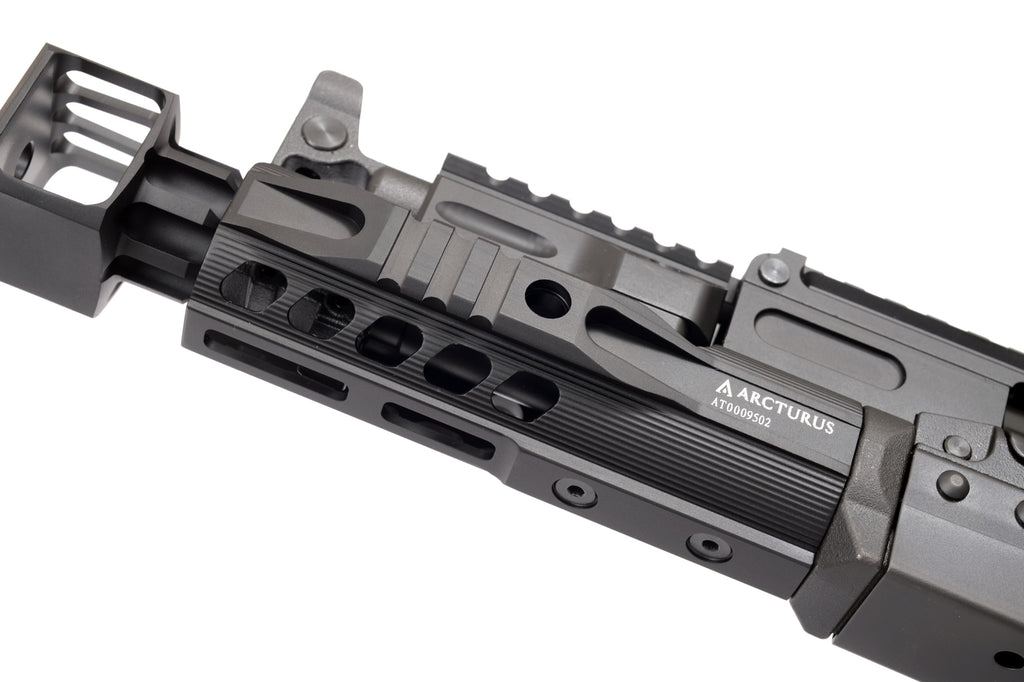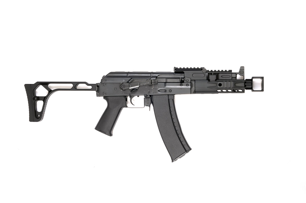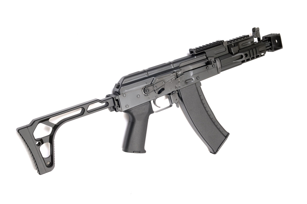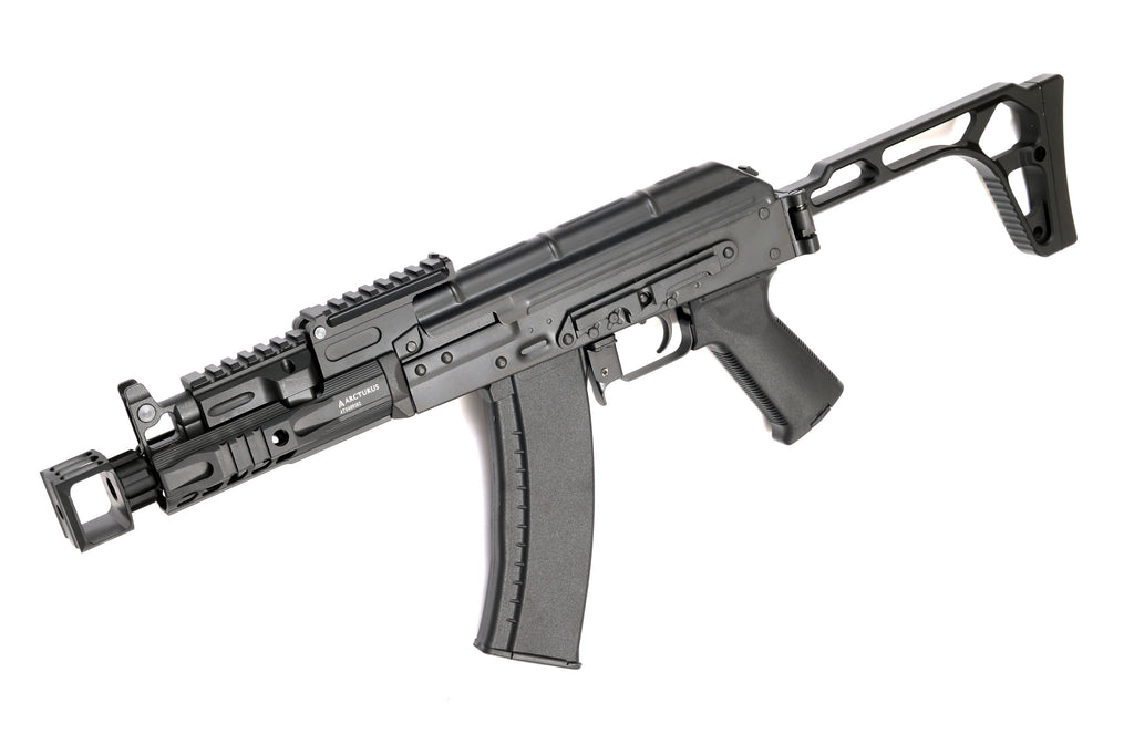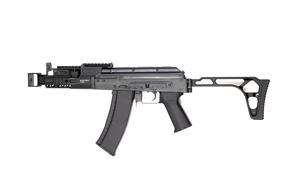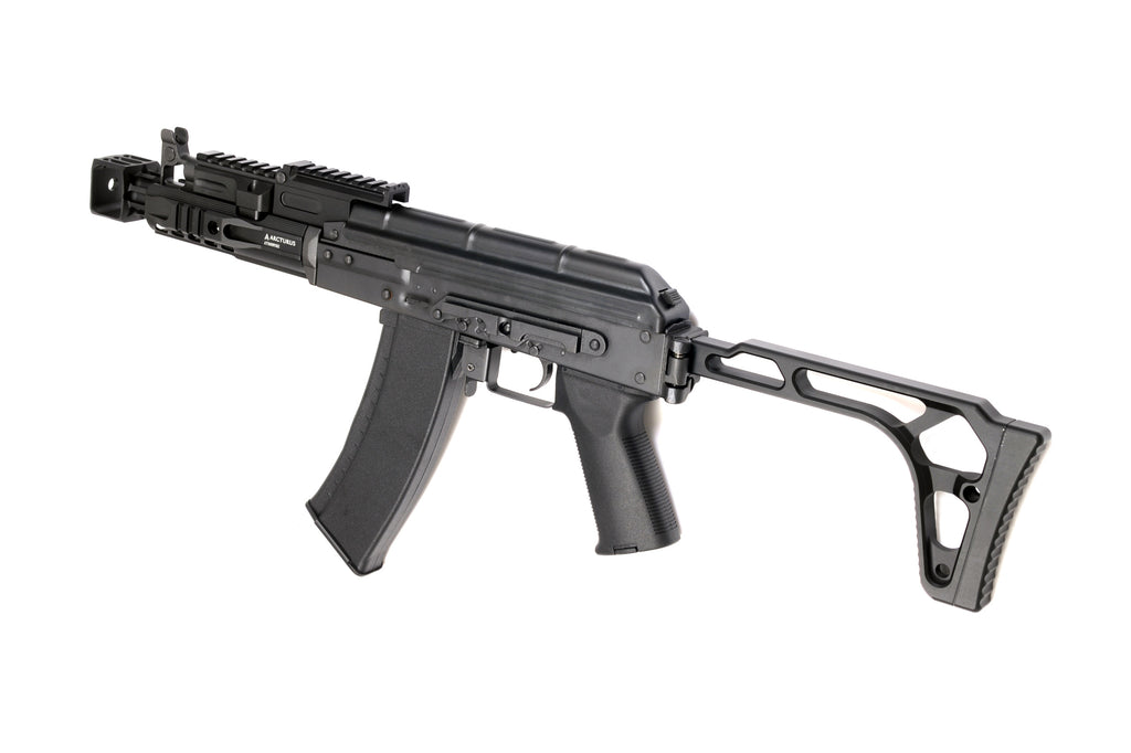 ARCTURUS AK74U Custom AEG electric gun is an extremely compact and modern AK series airsoft rifle. The gun features a short barrel, an eye catching muzzle brake, and a compact folding stock. The front end includes an aluminum M-LOK and RIS compatible handguard. The top and side surfaces of the handguard feature standard picatinny/RIS rails for attaching sights or grips. On the left side of the receiver, you will find an AK style side mount for Russian type optics or accessory rails. The stock can be folded for easier transport or for use in very confined spaces.