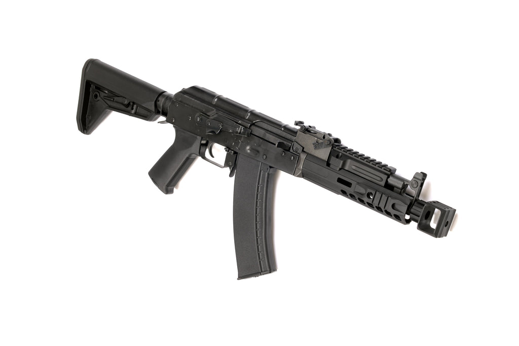 ARCTURUS K9 Custom AEG electric gun is an extremely compact and modern AK-series airsoft rifle. The gun features a short outer barrel and a striking muzzle brake. The front end includes an aluminum M-LOK and RIS compatible handguard. The top and bottom of the handguard feature standard picatinny/RIS rails for mounting sights or vertical grips. The sides of the handguard are equipped with M-LOK compatible slots. On the left side of the receiver, you will find an AK-style side mount for Russian type optics or accessory rails. The stock length is easy to adjust thanks to the M4-style retractable stock system.