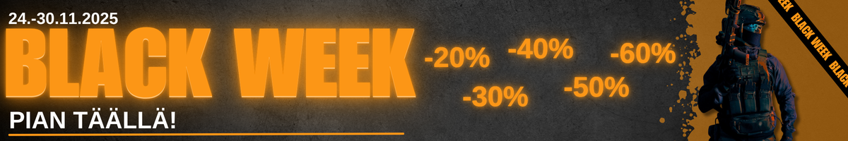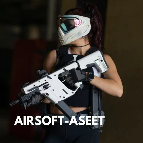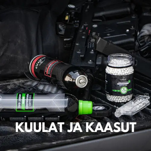 Meiltä löydät kaiken, mitä tarvitset airsoft-harrastukseesi, oli suosikkisi sitten sähköinen airsoft-ase (AEG), kaasukäyttöinen blowback-kivääri tai tarkkuuskivääri. Varastossamme on tuotteita johtavilta valmistajilta, kuten Specna Arms, Tokyo Marui, Wolverine Airsoft, Silverback, GHK, Umarex ja VFC. Airsoft-aseiden lisäksi onnistunut peli edellyttää laadukkaita kuulia ja luotettavia käyttökaasuja. Tarjoamme laajan valikoiman biohajoavia BB-kuulia painoluokissa 0,20 g – 0,45 g, jotka soveltuvat täydellisesti erilaisiin pelityyleihin ja olosuhteisiin. Kaasukäyttöisiin airsoft-aseisiin toimitamme huippuluokan käyttökaasuja, kuten Nimrod Airsoft Gas – pelaajien luottovalinta – sekä perinteistä green gasia ja CO2-patruunoita.