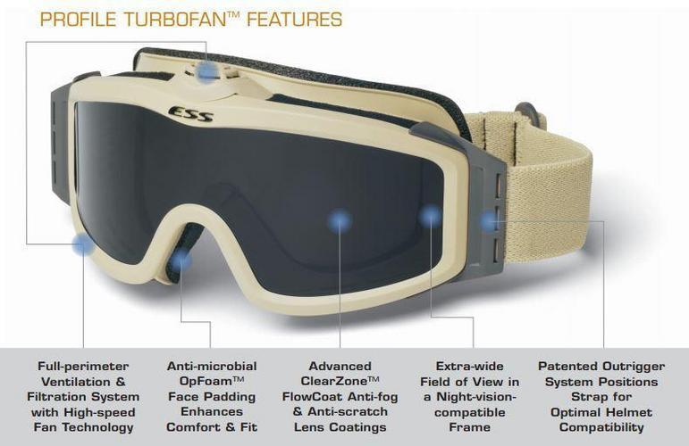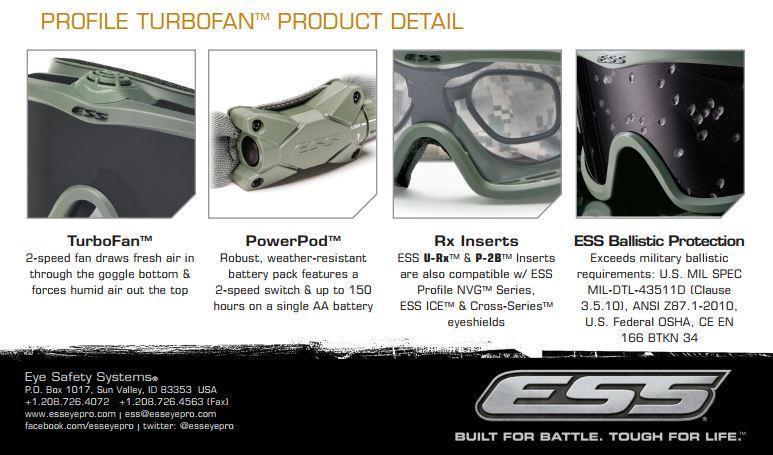 ESS Profile TurboFan ballistiset suojalasit ovat tuulettimella varustetut täysin huurtumattomat suojalasit. Tuulettimessa on kaksi asentoa: low ja high. Pimeänäkölaitteen kanssa yhteensopivat.