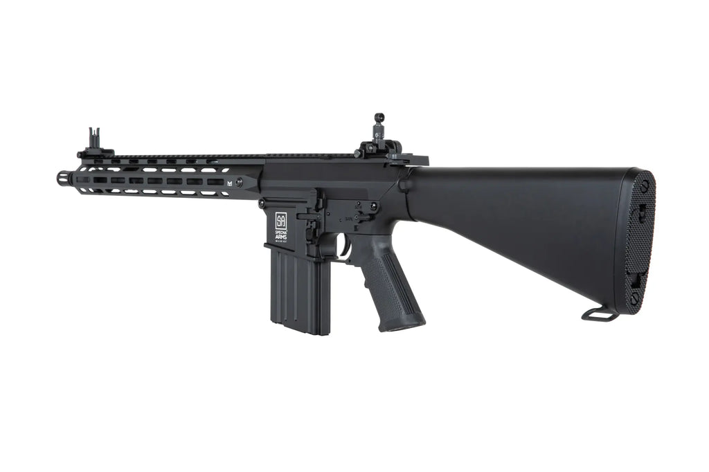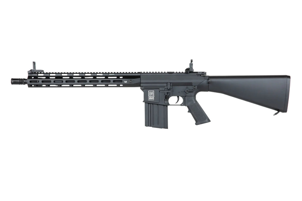 The replica is the result of a collaboration between Specna Arms and Double Bell. The Specna Arms SA-E38 EDGE™ is an electric SR-25 style airsoft replica designed specifically for long-range roles and DMR use. The weapon uses SR-25 style magazines and is equipped with a fixed stock, which provides excellent stability and a realistic appearance. The M-LOK compatible rail system on the front allows for easy attachment of optics, grips and other accessories - a perfect choice for DMR projects.
