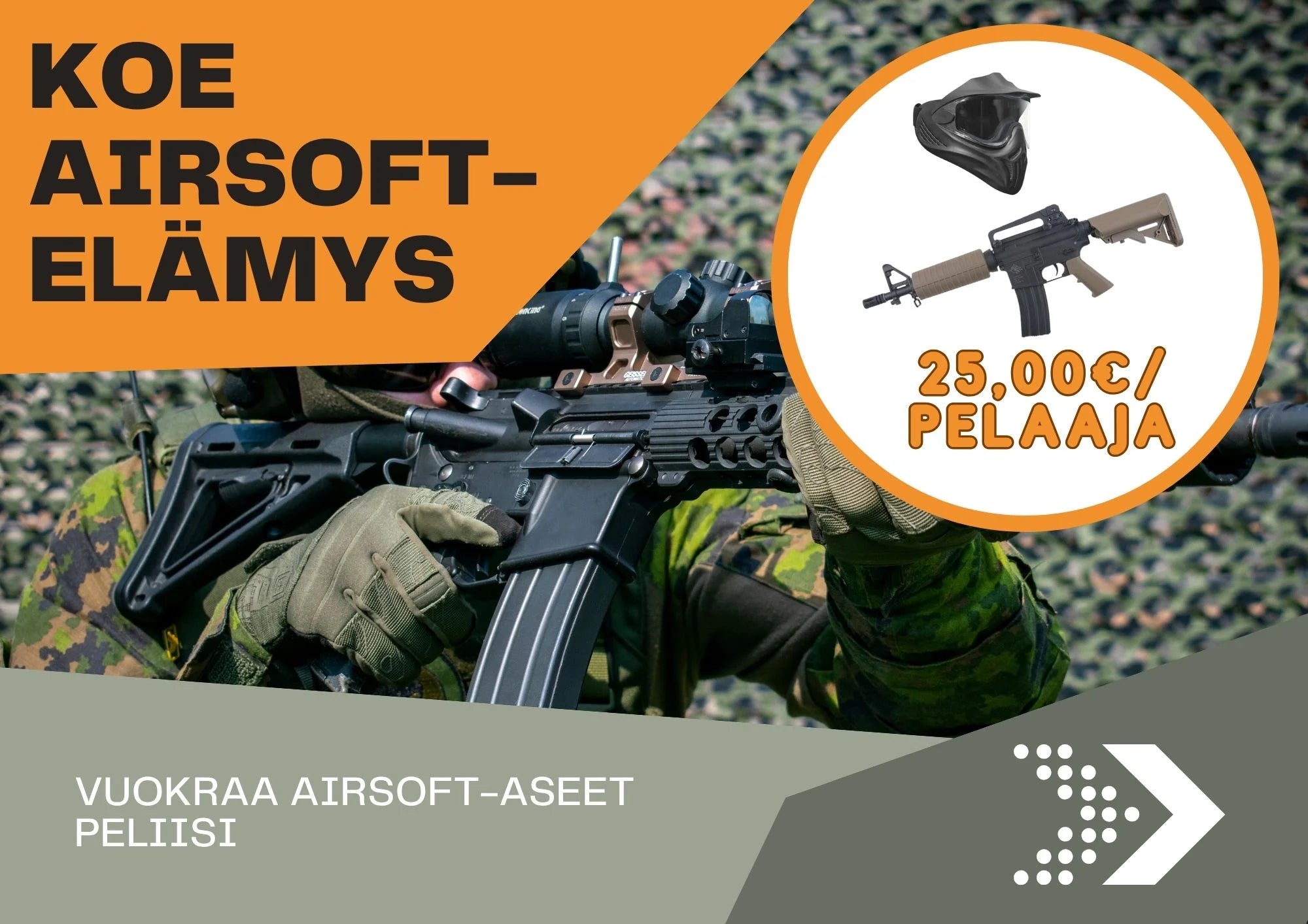 Vuokraamostamme voit vuokrata laadukkaat airsoft-aseet, suojavarusteet, kuten suojalasit, maskit ja taktiset liivit, sekä kaikki tarvittavat lisätarvikkeet. Tarjoamme erilaisia airsoft-paketteja, jotka sisältävät kaiken tarvittavan unohtumattomaan peliin, olipa kyseessä yksityinen tapahtuma, syntymäpäiväjuhla, yrityksen virkistyspäivä tai muu tilaisuus.