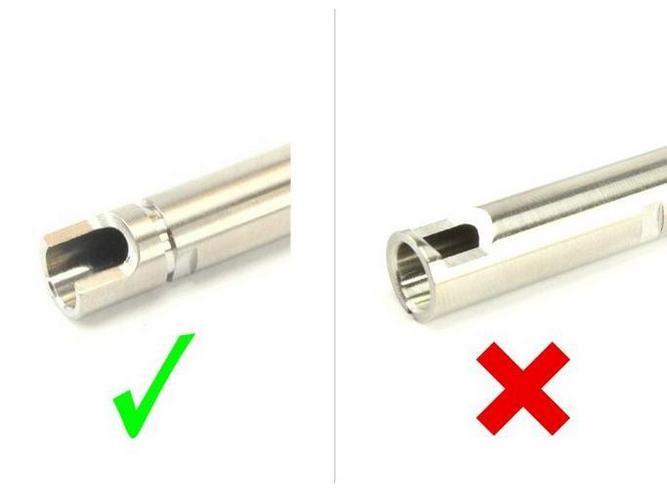- Kaarevan pidennetyn painajan vuoksi U-muotoiltu painajanvarsi on yhteensopiva ainoastaan avoimella hop-up ikkunalla varustettujen piippujen kanssa (katso kuva). Mikäli piippusi ei ole yhteensopiva painajanvarren kanssa, niin hop-up ikkunan sulkevan sillan voi omalla vastuulla leikata pois.