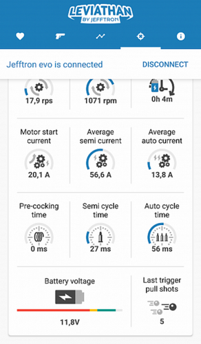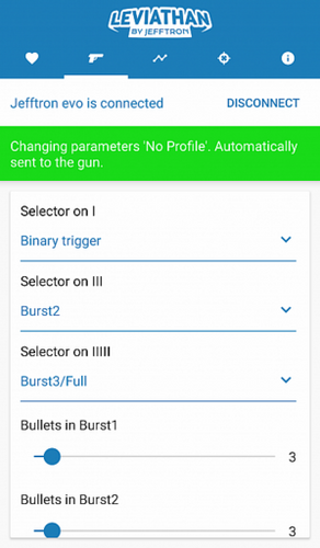 - Ohjelmoinnin asetukset tallentuvat reaaliajassa Leviathan - EVO3 muistiyksikköön. Toisin sanoen et menetä asettamiasi asetuksia, vaikka Bluetooth yhteys katkeaisi tai akku irroitettaisiin aseesta keskes yksikön säädön.