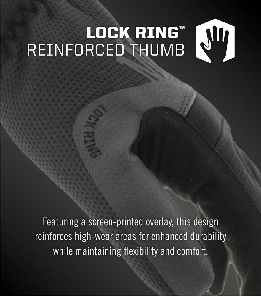 Lock Ring™ -vahvistus peukalon tyvessä: Lisää kestävyyttä kulutukselle alttiilla alueella.