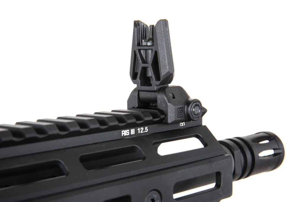 Specna Arms Daniel Defence RIS III 12.5” SA-E28 EDGE HAL ETU on metallirunkoinen ja tukevalla M-LOK yhteensopivalla kisko järjestelmällä varustettu airsoft-ase. SA-E28 mallintaa tuliaseita valmistavan Daniel Defense® päivitetty RIS III kiskolla varustettua AR-15 mallia. SA-E28 EDGE on valmistettu Daniel Defense®:n lisenssin alaisuudessa ja tämän vuoksi aseessa on pystytty jäljittämään aseen esikuvaa merkintöjä myöten. RIS III kisko eroaa perinteisestä Daniel Defencen kiskosta siten, että sen sivu- ja alapinnoilla olevat RIS yhteensopivat kiskot on korvattu M-LOK yhteensopivilla kiskoilla. M-LOK kiinnityspaikat mahdollistavat lisälaitteiden kiinnittämisen suoraan M-LOK paikoille. Aseen päältä löytyvä pitkä kisko mahdollistaa erilaisten optisten tähtäimien kiinnittämisen aseeseen ja sivu sekä alakisko ovat oivia paikkoja erilaisille kahvoille tai asevaloille. Aseen 12,5″ tuuman ulkopiipun päästä löytyy 14mm CCW kierteet suuliekinvaimentimen alta äänenvaimentimen tai valojuovalaitteen asentamiseksi.