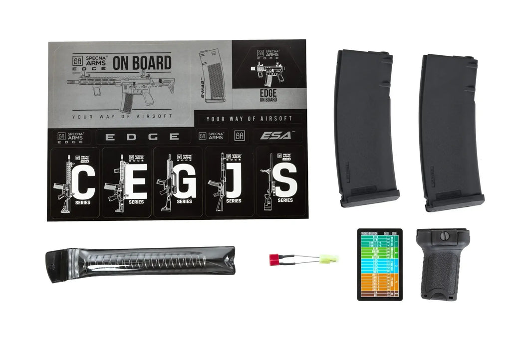 Specna Arms EDGE mallisto yhdistää innovatiivisia ratkaisuja ja ominaisuuksia, joita useimmat airsoft-valmistajat eivät tarjoa samassa aseessa. EDGE mallisarjaa voisi luonnehtia valmiiksi viritetyksi airsoft-aseeksi, jonka voi nostaa suoraan laatikosta pelikentille ilman tarvetta muutostöille parhaan suorituskyvyn saavuttamiseksi. EDGE malliston tuorein sukupolvi on varustettu ohjelmoitavalla elektroniikkayksiköllä, mikä varmistaa koneiston erittäin tarkan toiminnan ja säätöominaisuudet. Mikäli muutostöille on kuitenkin tarvetta, esimerkiksi aseen tehon säätämiseen, tehonvaihto on tehty äärimmäisen helpoksi kätevän pikajousenvaihto-ominaisuuden avulla.