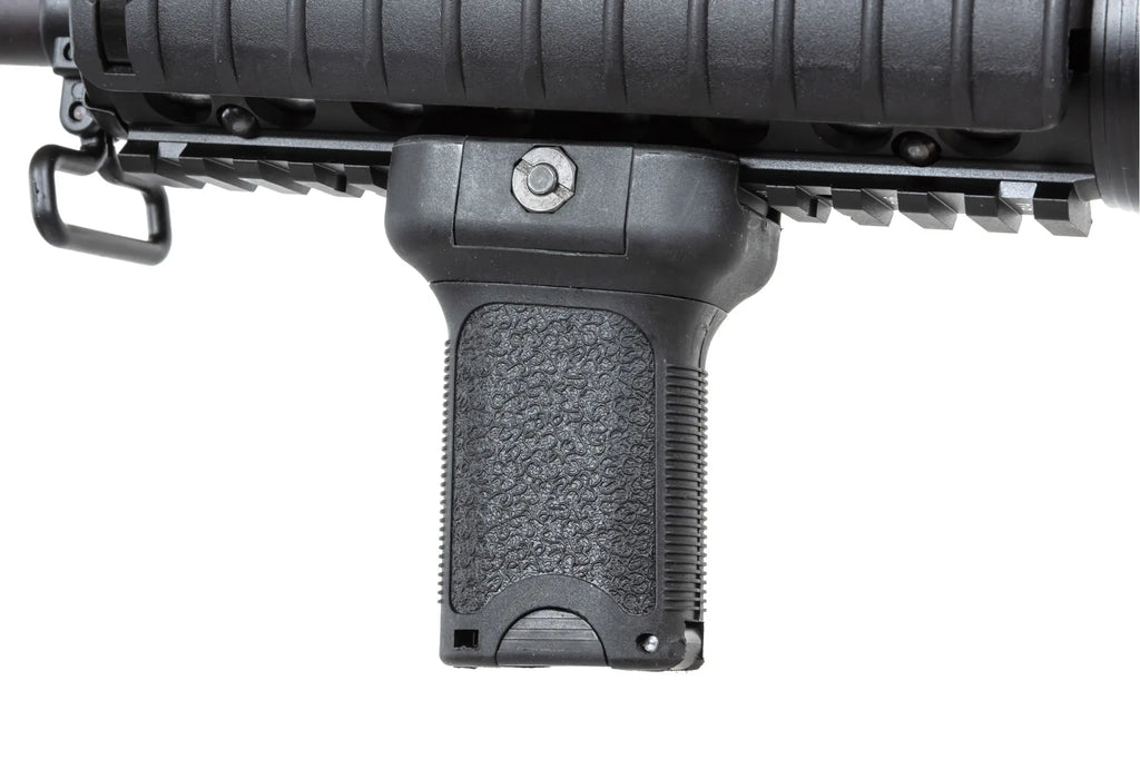 Specna Arms RRA SA-E03 EDGE™ HAL ETU™ karbiini on metallirunkoinen AR-15 variantti, joka on varustettu klassisella KAC RIS tyylisellä kiskojärjestelmällä. Kiskojärjestelmään on mahdollista kiinnittää monenlaisia taktisia lisävarusteita kuten asevaloja, kahvoja, laser- tai optisia tähtäimiä. Paketin mukana toimitetaan 2 muovista kiskopanssaria ja taktinen vertikaalinen etukahva. Aseen päältä löytyy pitkä picatinny / RIS kisko erikseen myytävien optisten tähtäimien kiinnittämiseksi suoraan kiskoon. Aseen ulkopiipun päästä löytyy yleisen standardin mukaiset negatiiviset 14mm kierteet (14mm CCW) vaimentimien kiinnittämiseksi.