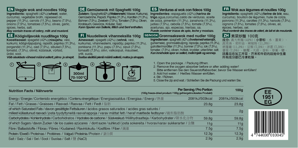 Vihanneswok nuudeleilla on varta vasten kasvissyöjille kehitetty annos, mutta maistuu yhtä hyvin myös lihansyöjille. Vaikka ruoka on 100% kasvisruoka, se sisältää riittävän määrän ravintoaineita ja kaloreita, varmistaen riittävän energiamäärän myös vaativalla marssilla. Energiapitoisuus annosta kohti 503 kcal.